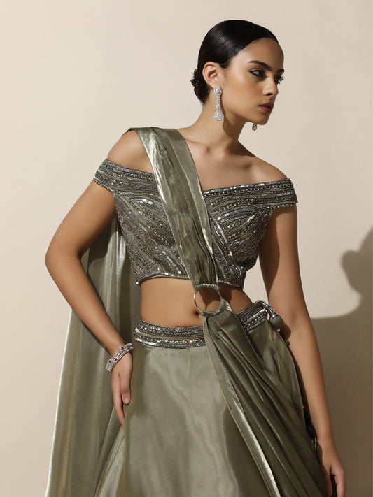 Olive Green Off-Shoulder Lehenga with Pleated Shoulder Drape, Antique Embroidery and Ring DetailRegular price Rs. 18,600.00Regular priceUnit price / per