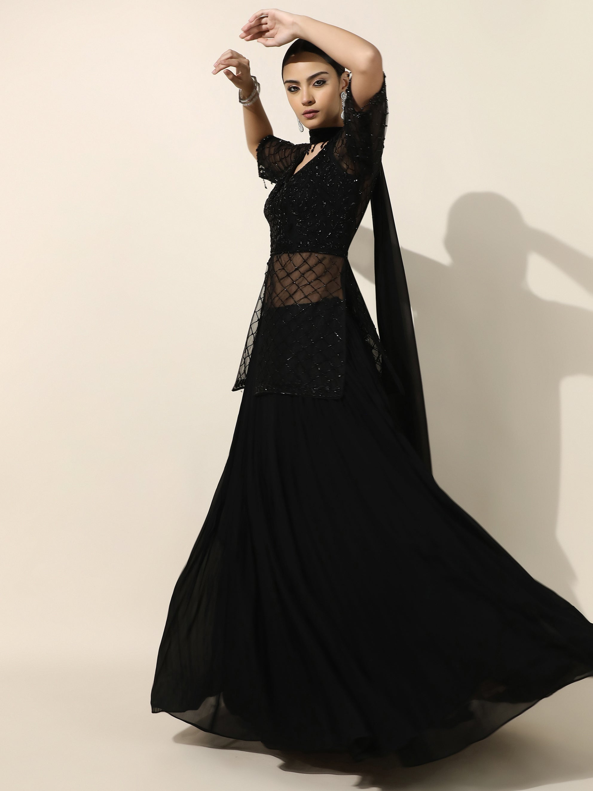 Black Crepe Drape Saree with Shoulder Embellished Cape and Detachable BeltRegular price Rs. 11,800.00Regular priceUnit price / per-