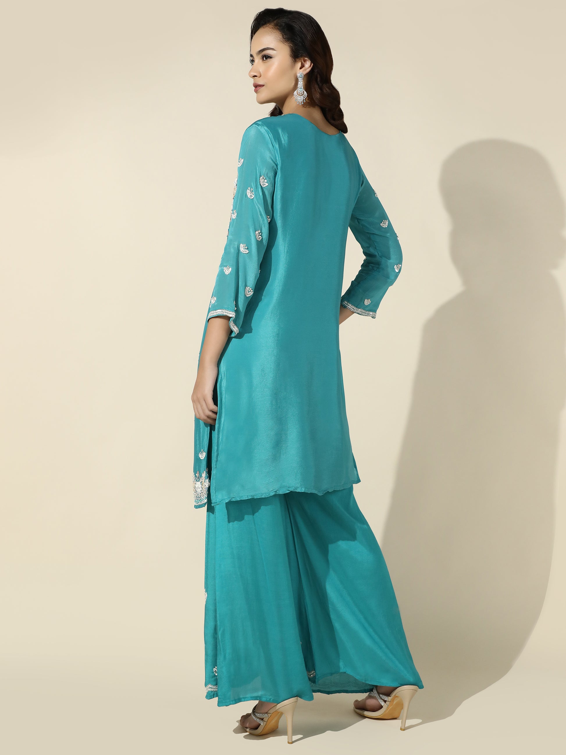 Blue Hand-Embroidered Suit with Palazzo Pant