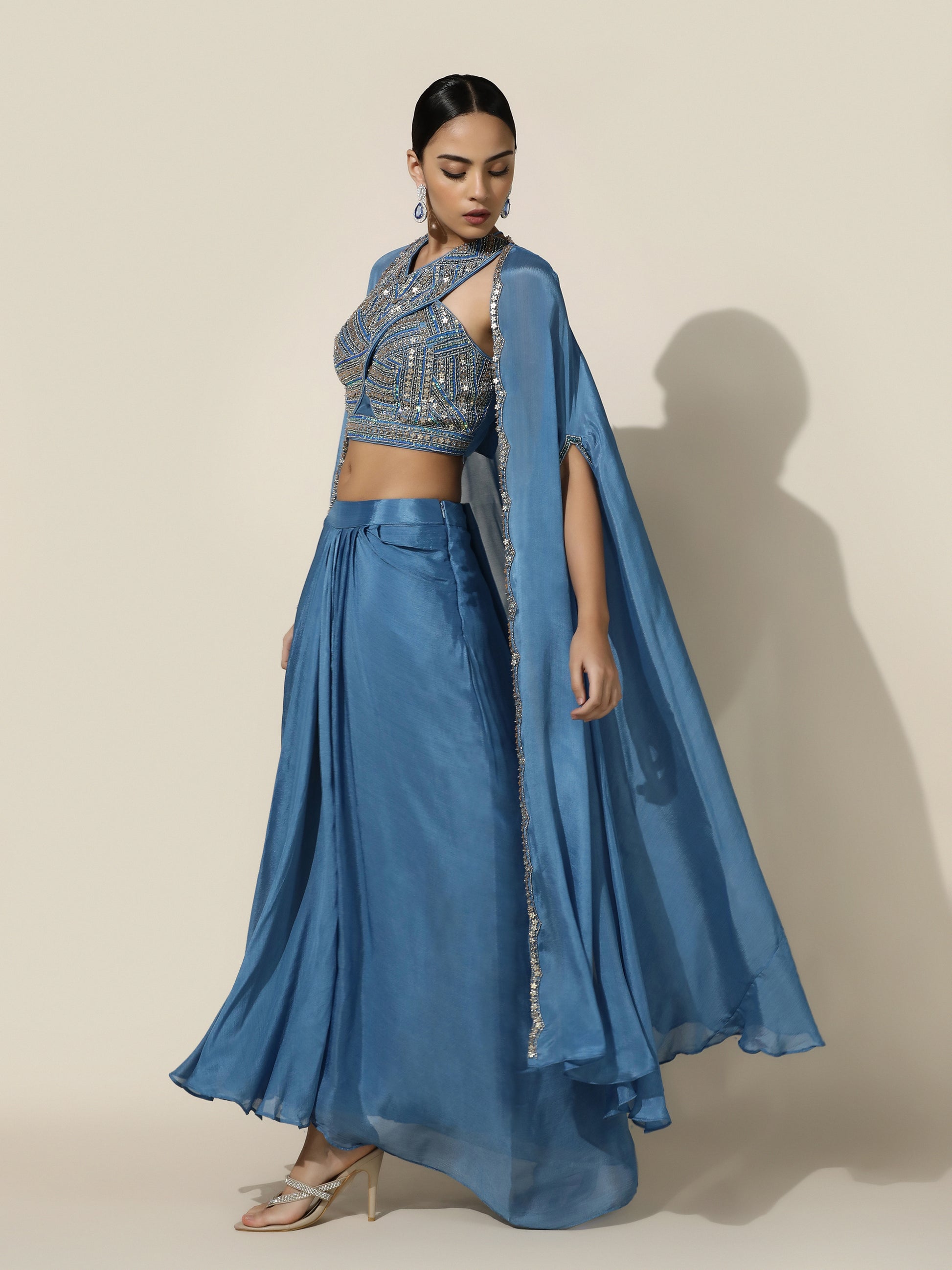 Blue Haulter Drape Cord-Set With Sheer Cape