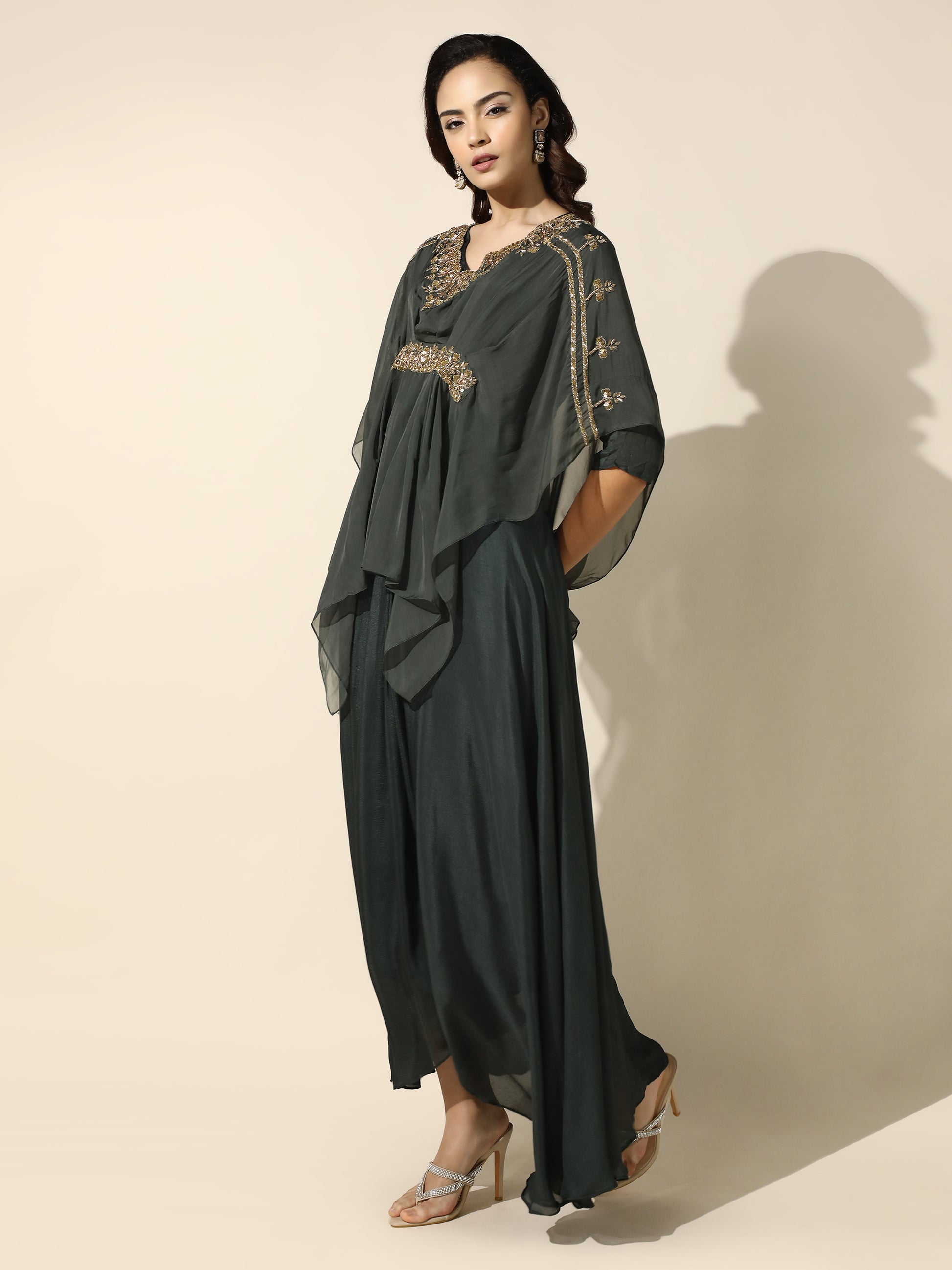 Embrace the perfect blend of comfort and class with our solid Anarkali paired with a kaftan shrug. Styled with a delicate handwork belt and graceful gathers, this piece is your go-to for understated sophistication 💫