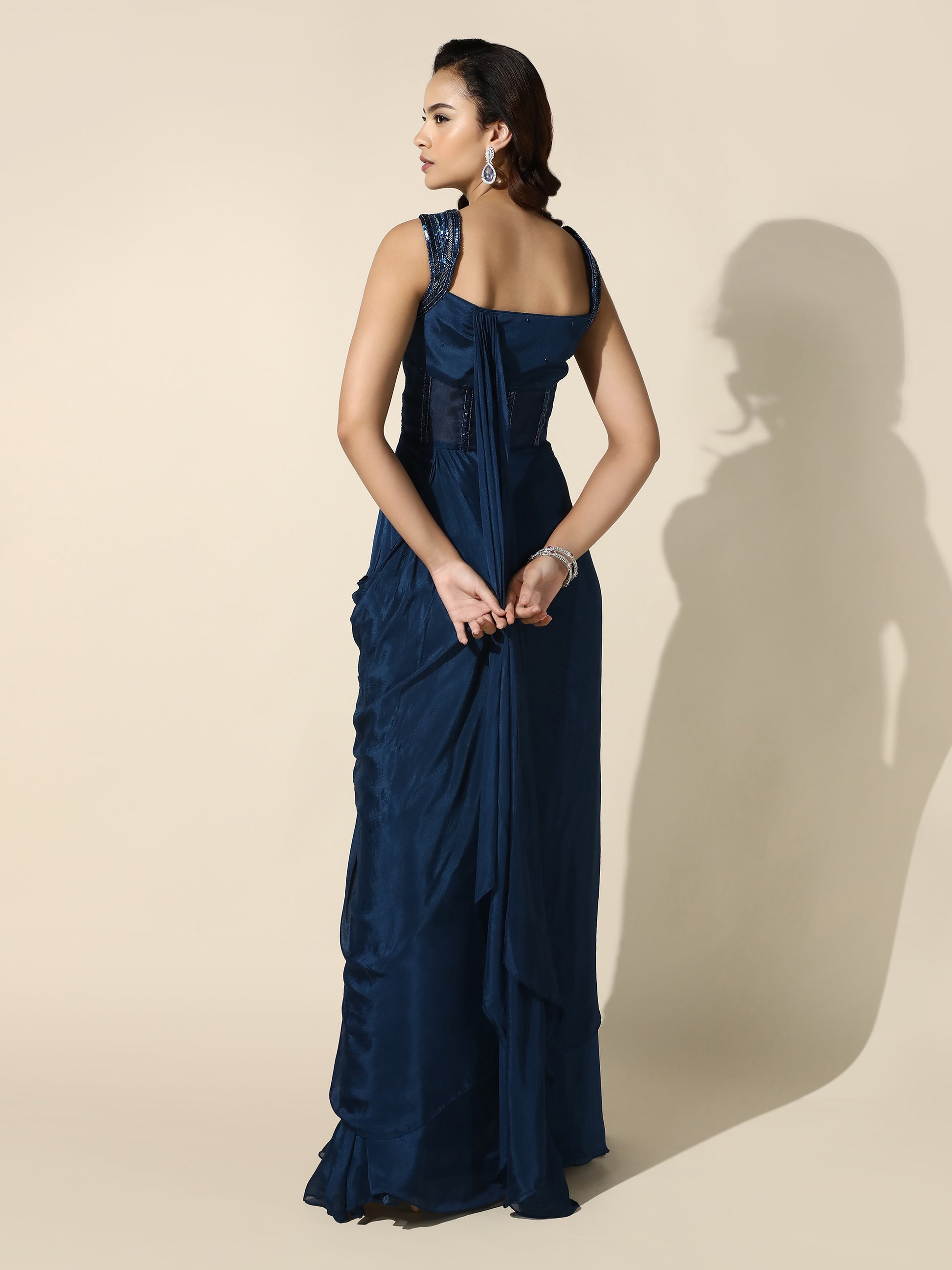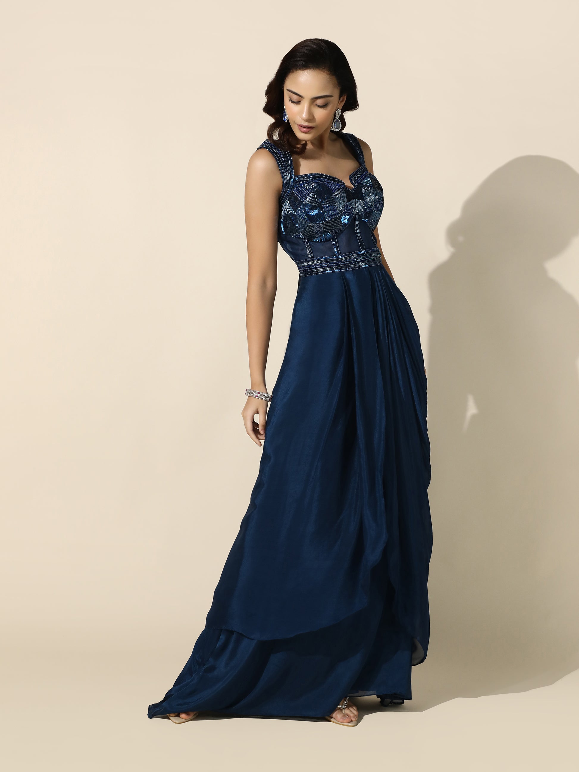 Embrace timeless elegance with our Midnight Blue Drape Saree. A perfect fusion of bold sophistication and contemporary design, featuring intricate embroidery, sequins work, and a stunning monochrome palette in shades of blue. With its saree-like drape and corset-inspired gown, this piece redefines modern grace ✨