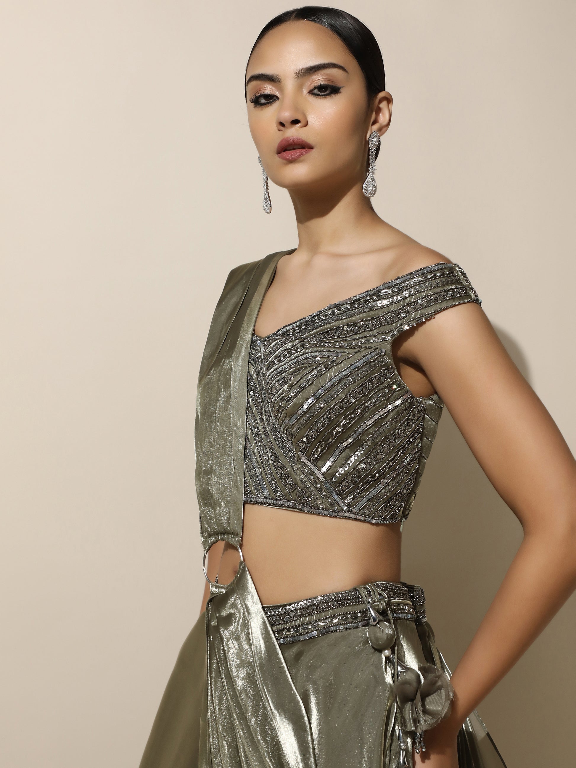 Olive Green Off-Shoulder Lehenga with Pleated Shoulder Drape, Antique Embroidery and Ring Detail